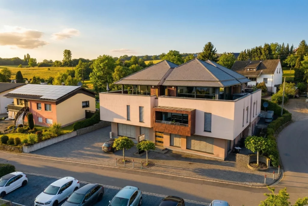 Die Obergeschosswohnungen sind Teil eines architektonisch ansprechenden Mehrparteienhauses mit insgesamt sieben Einheiten. Im Erdgeschoss befindet sich eine etablierte