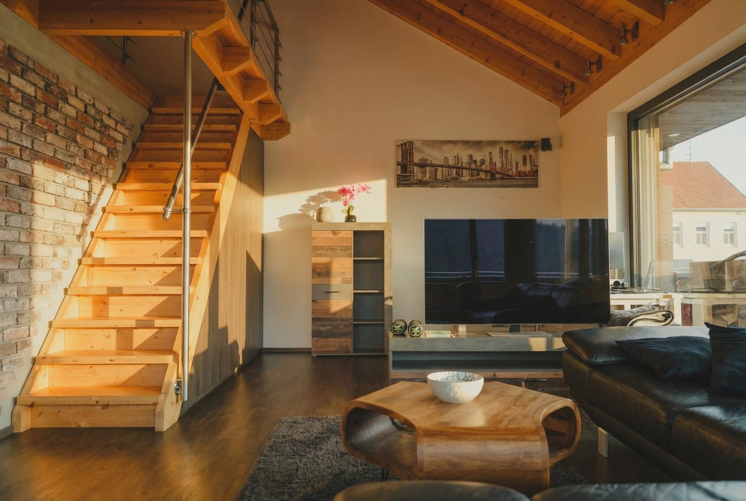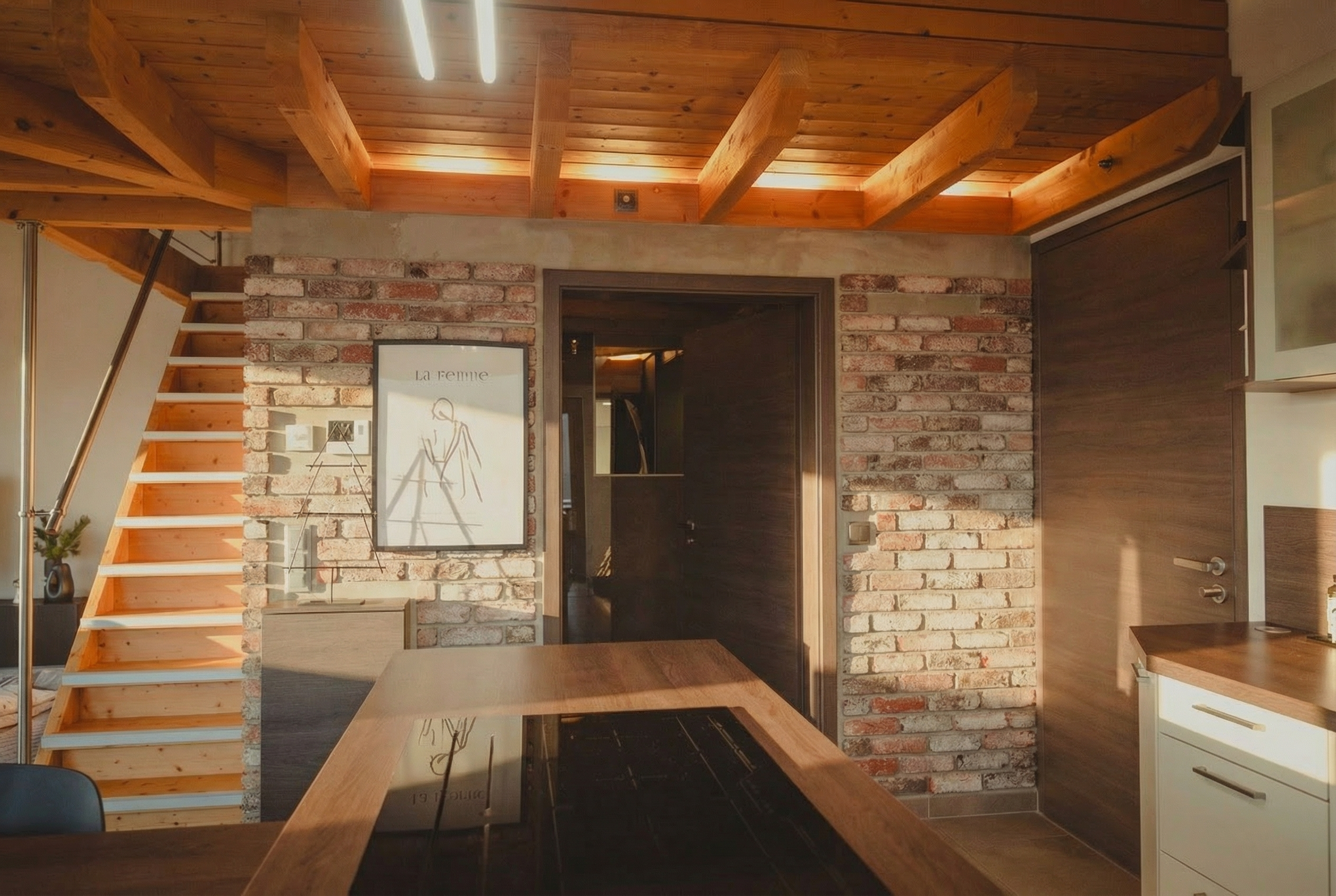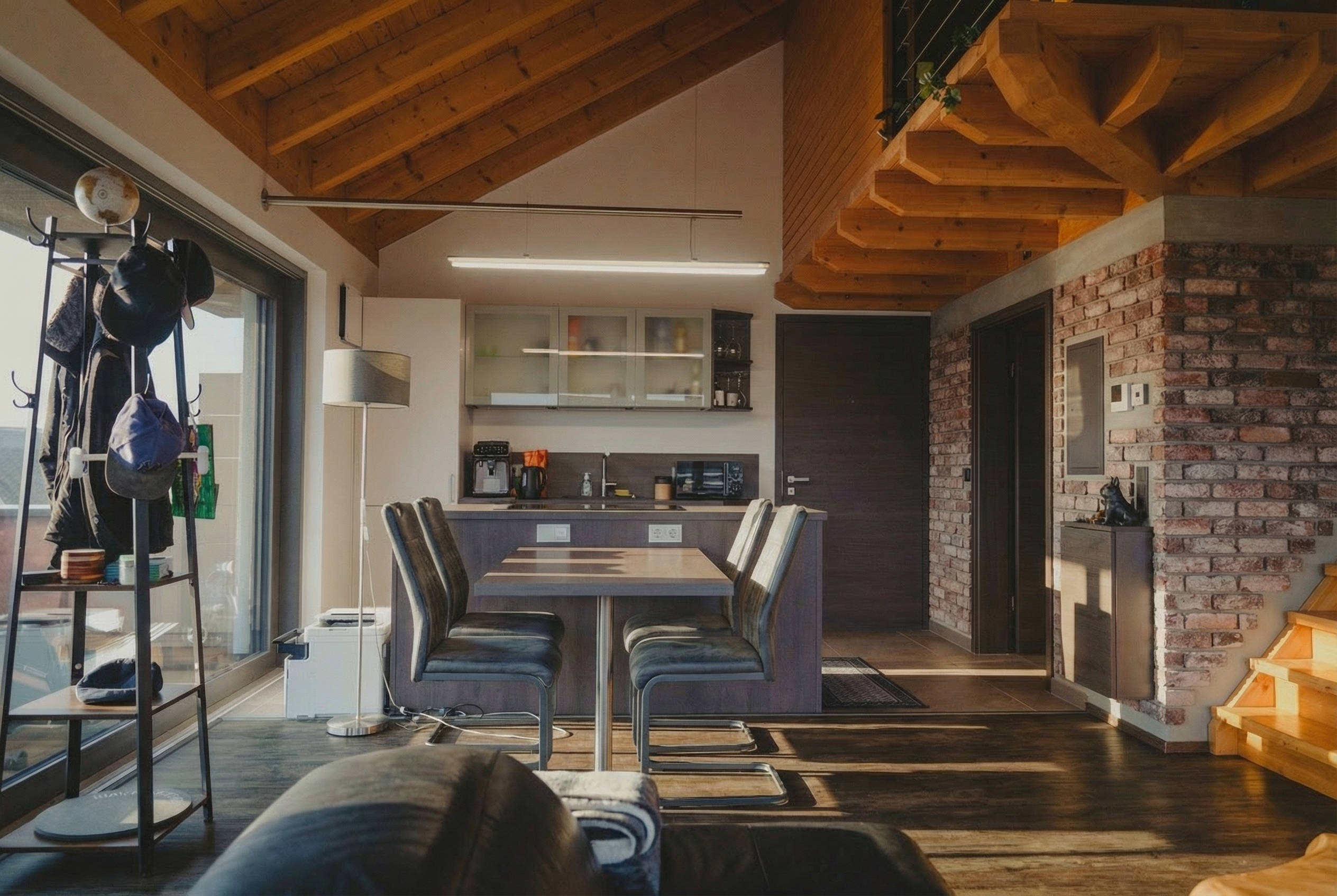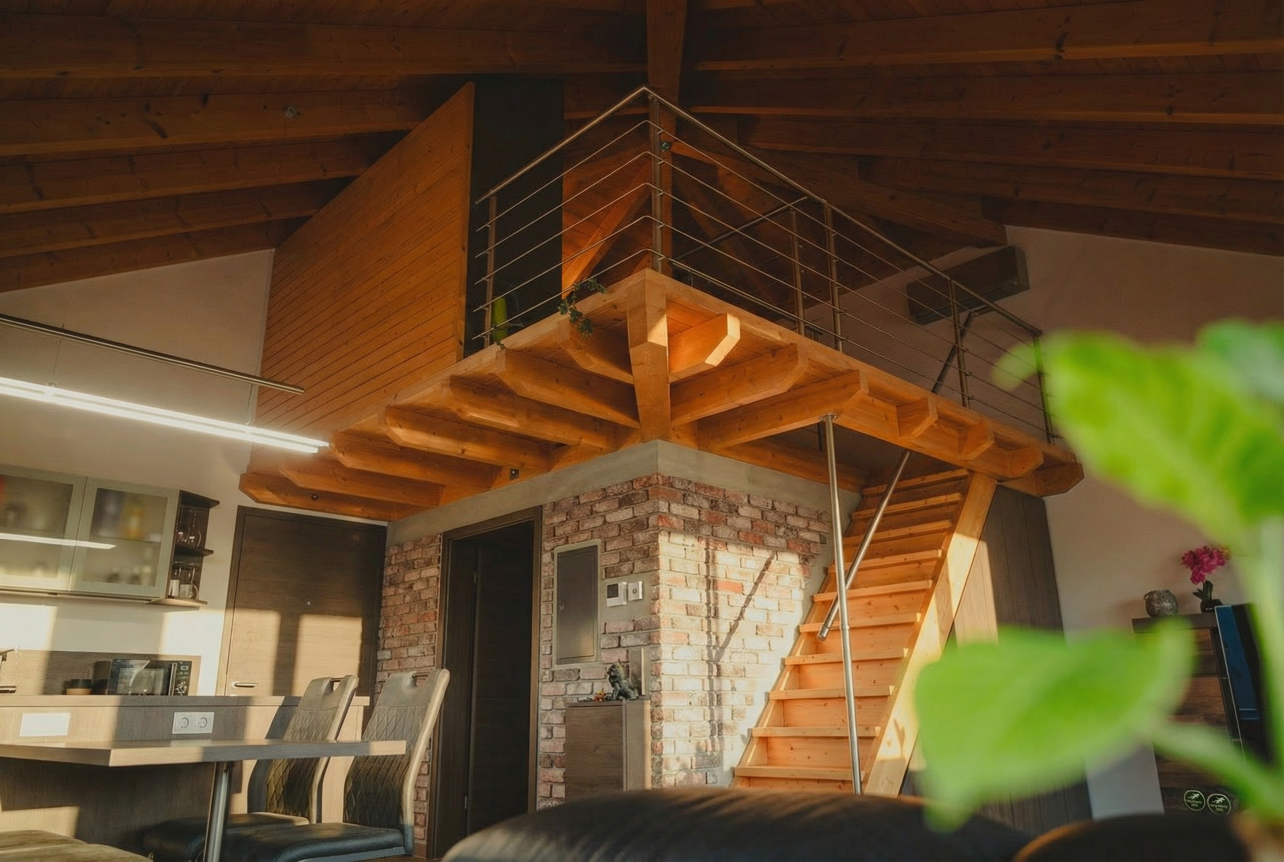 - Großzügige Raumhöhen und sichtbare Holzbalkendecken