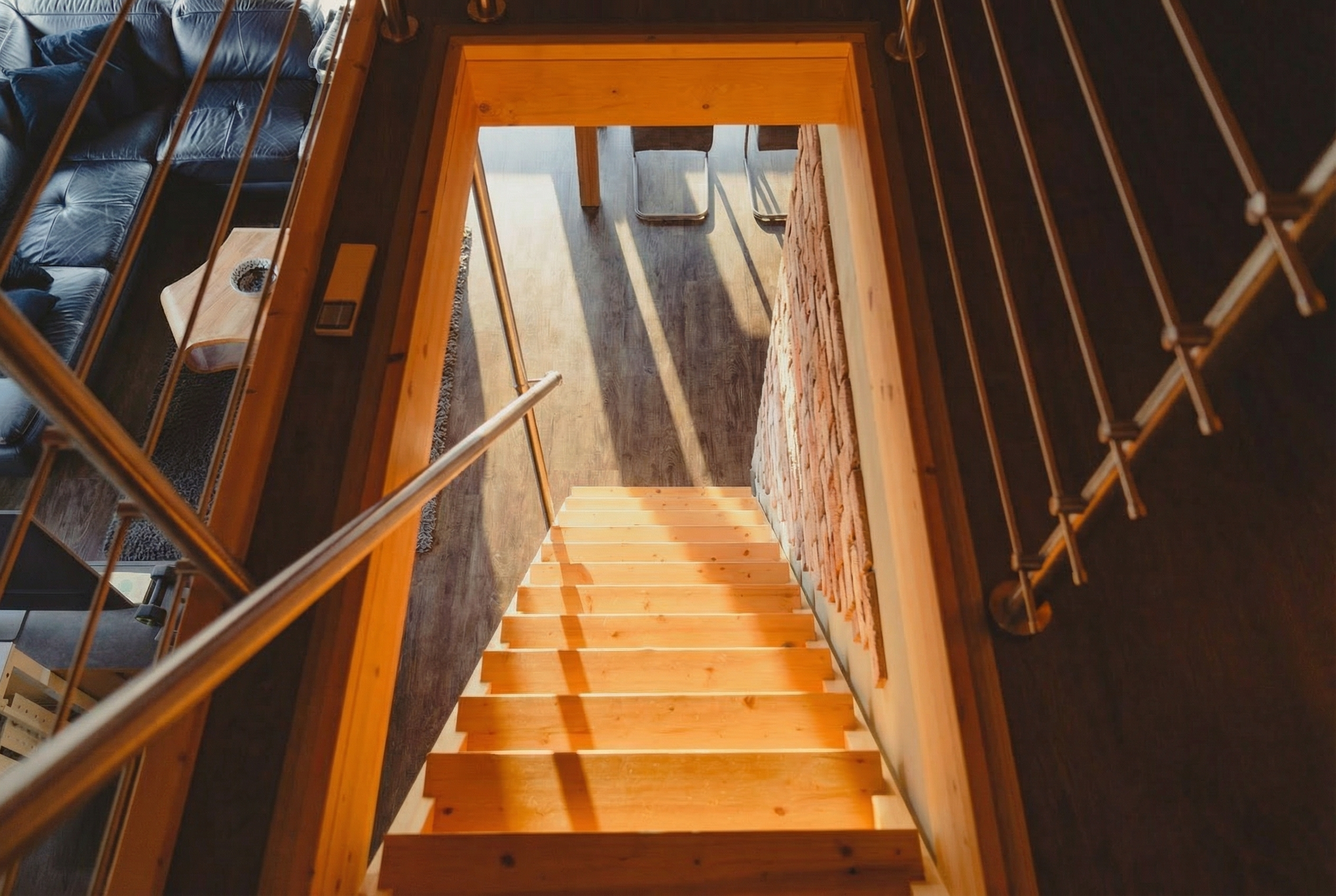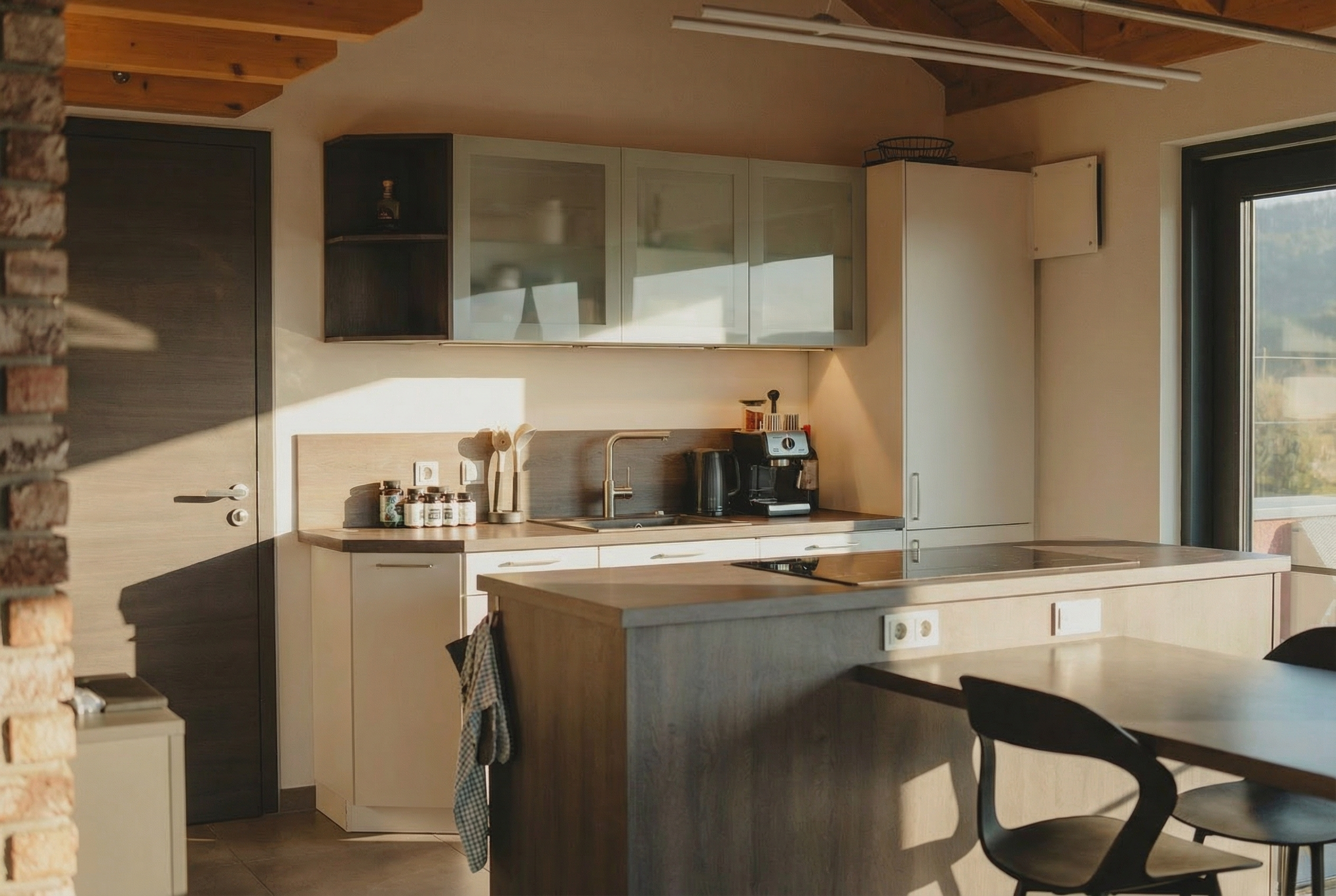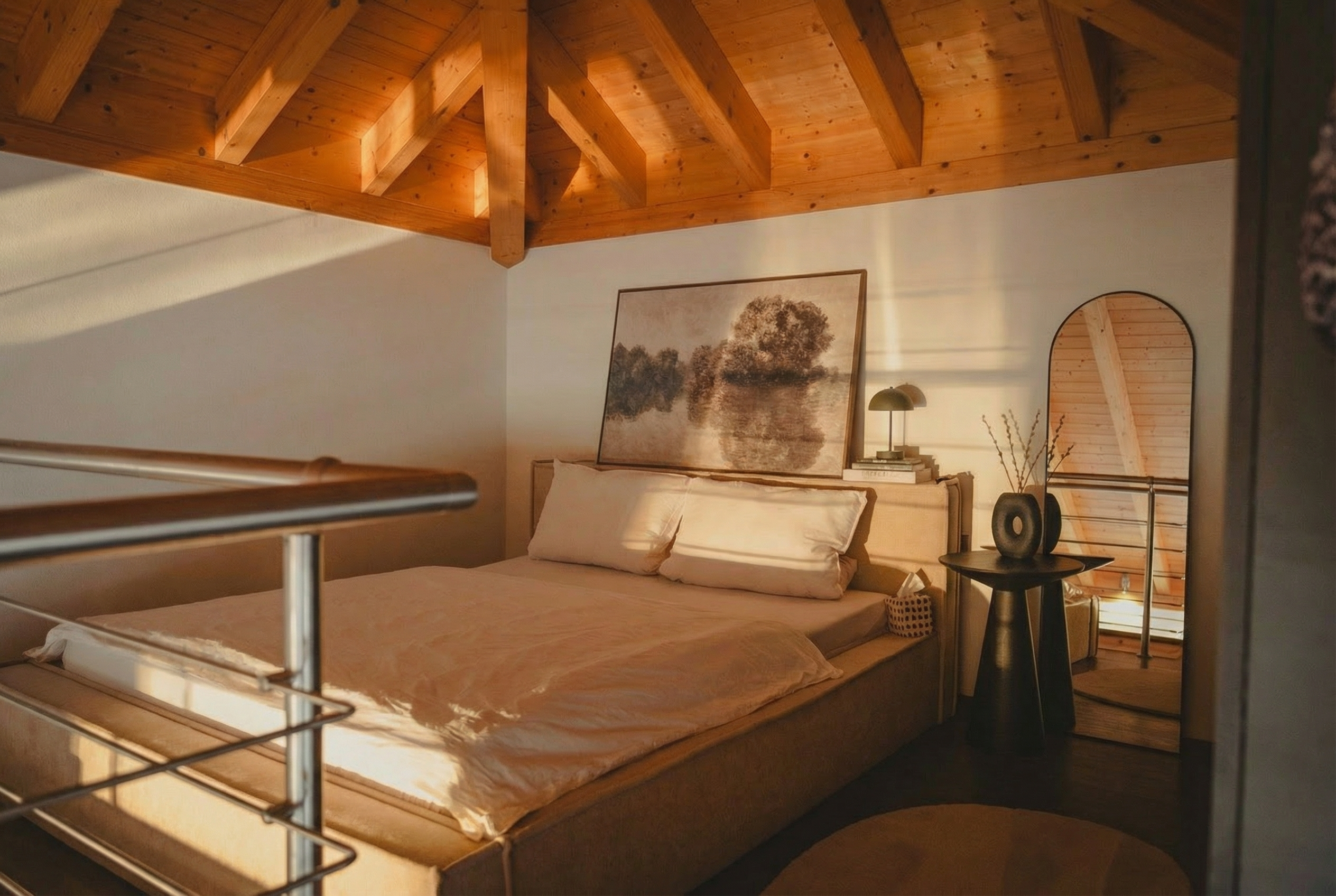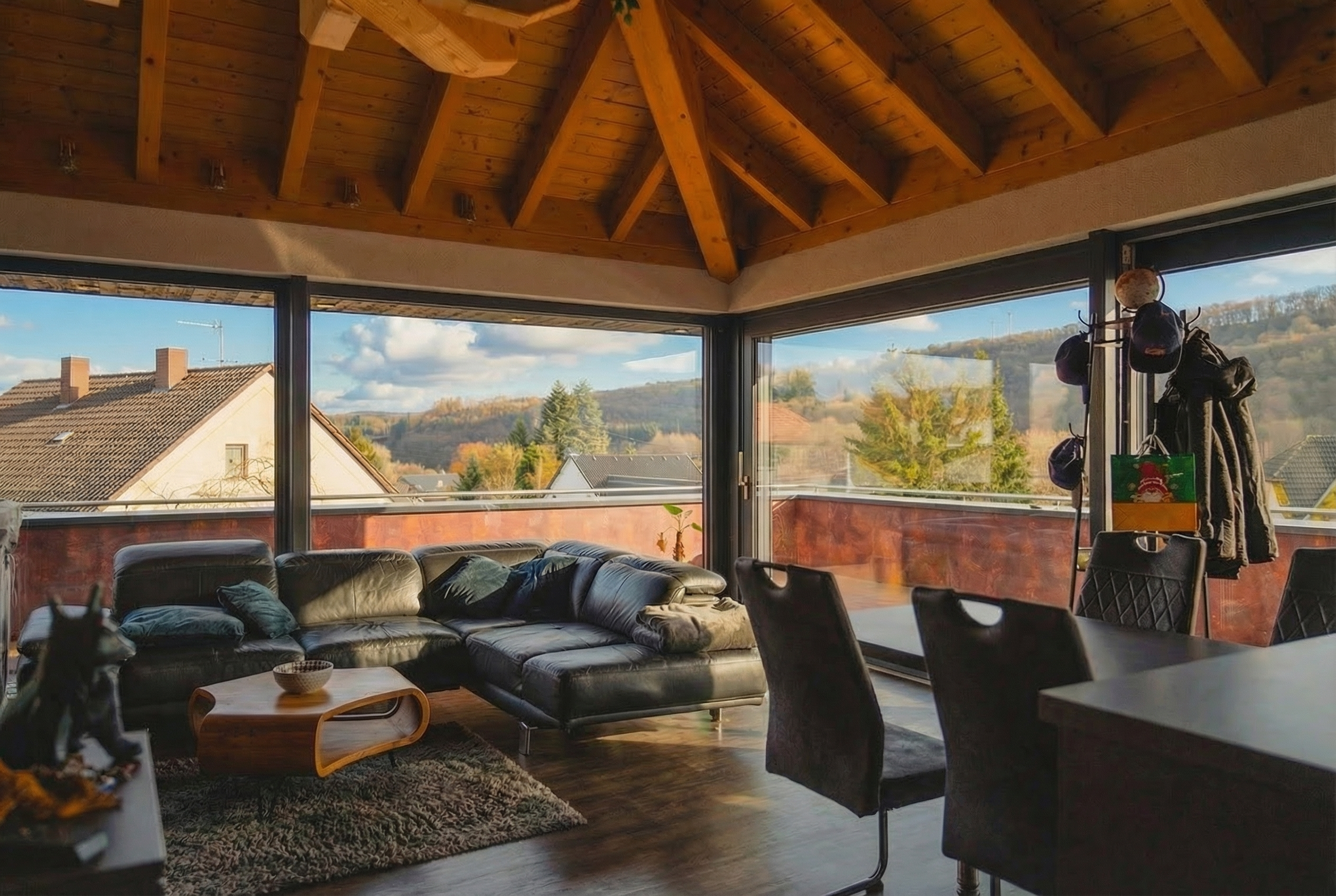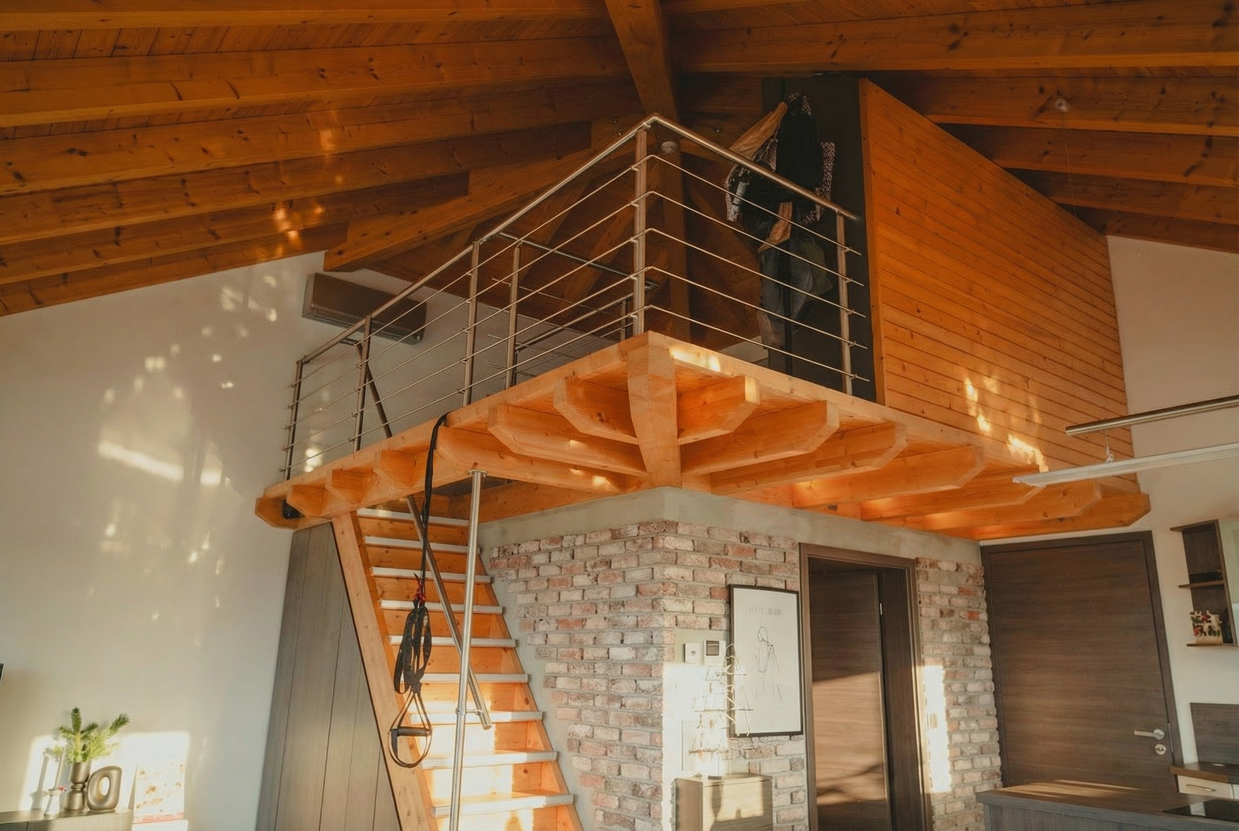 - Großzügige Raumhöhen und sichtbare Holzbalkendecken