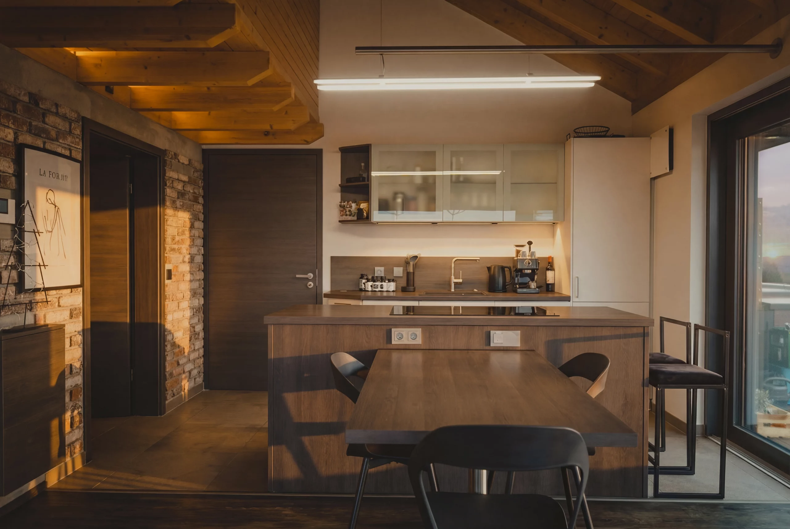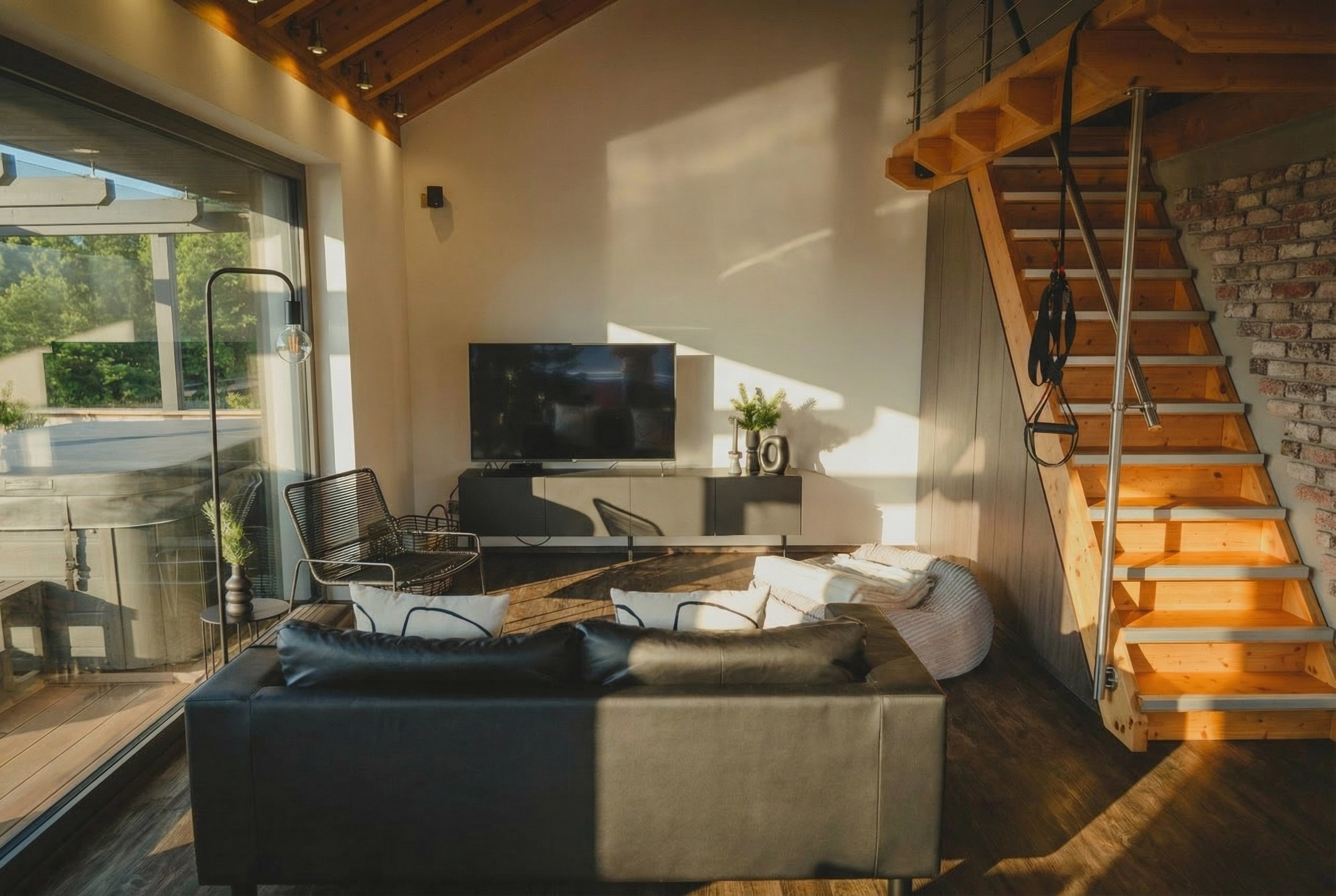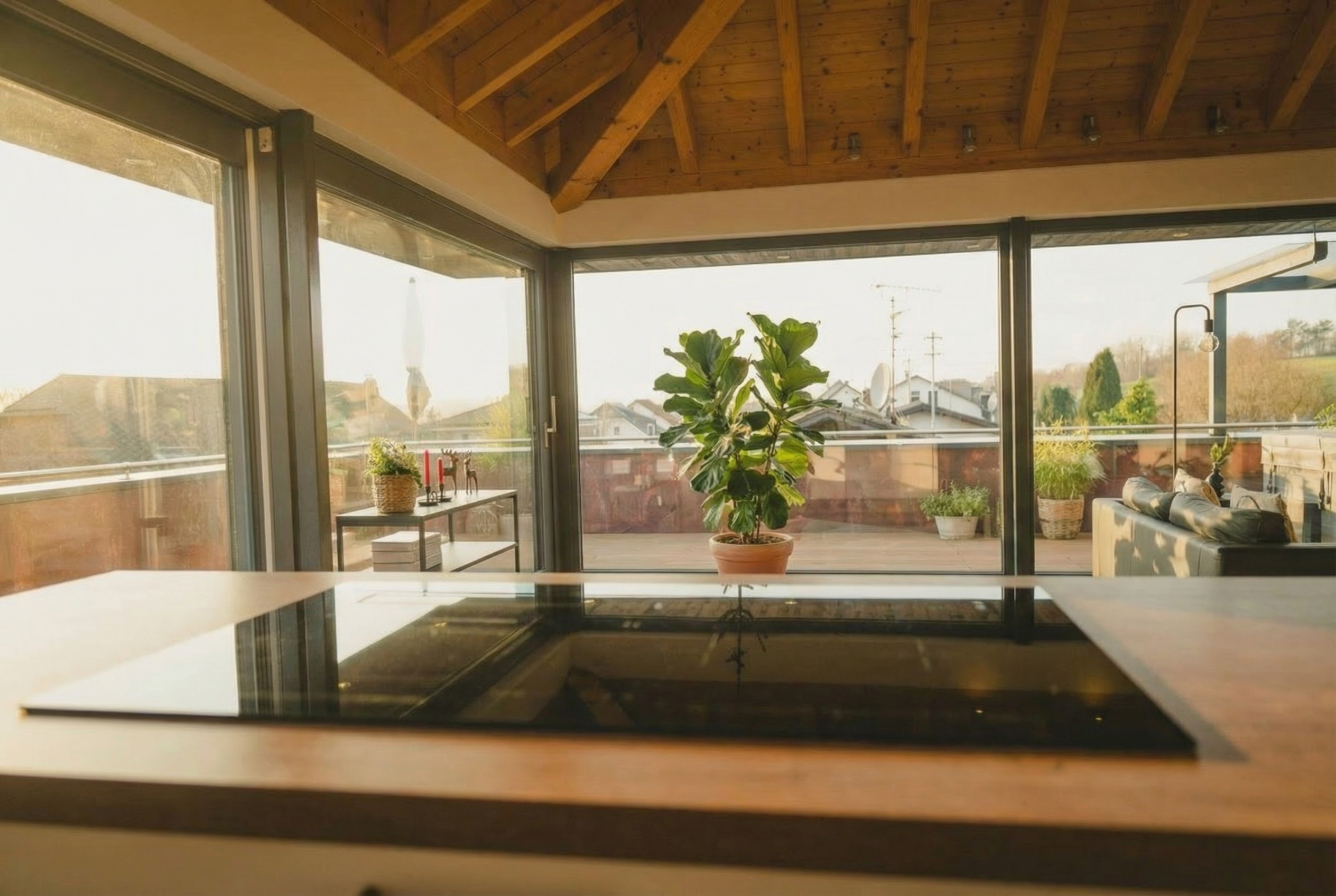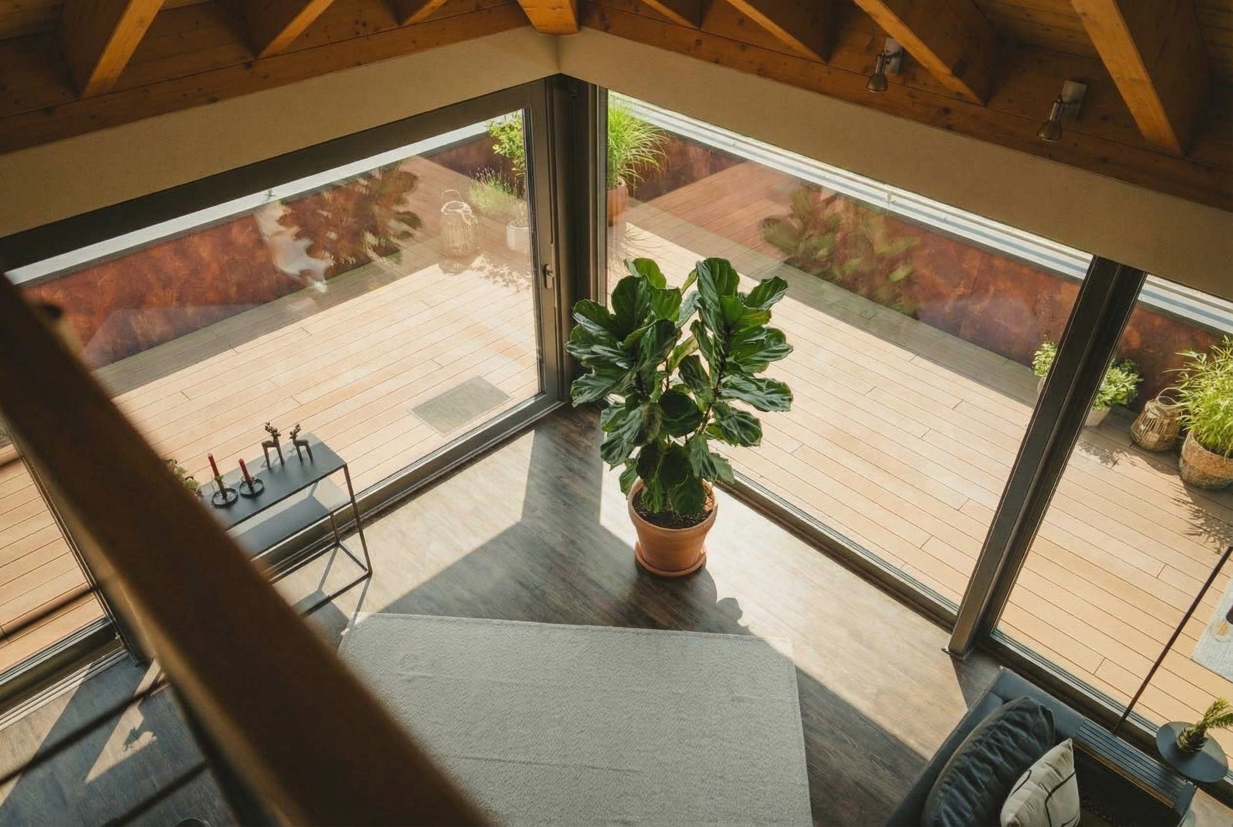 Die Penthousewohnungen bieten ein besonderes Wohngefühl, geprägt durch großzügige Raumhöhen, sichtbare Holzbalkendecken, offene Grundrisse und eine klare architektonische Gestaltung. Jede Einheit verfügt über eine private Dachterrasse mit fest installiertem Whirlpool und bietet damit ein hohes Maß an Wohnkomfort und Privatsphäre.