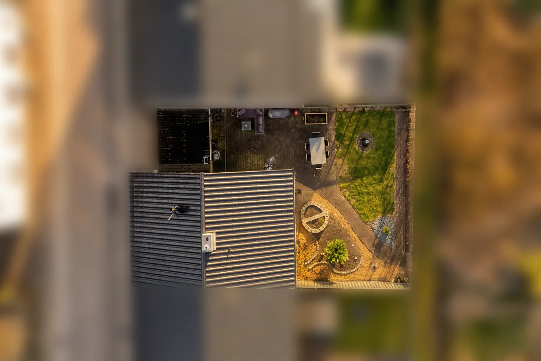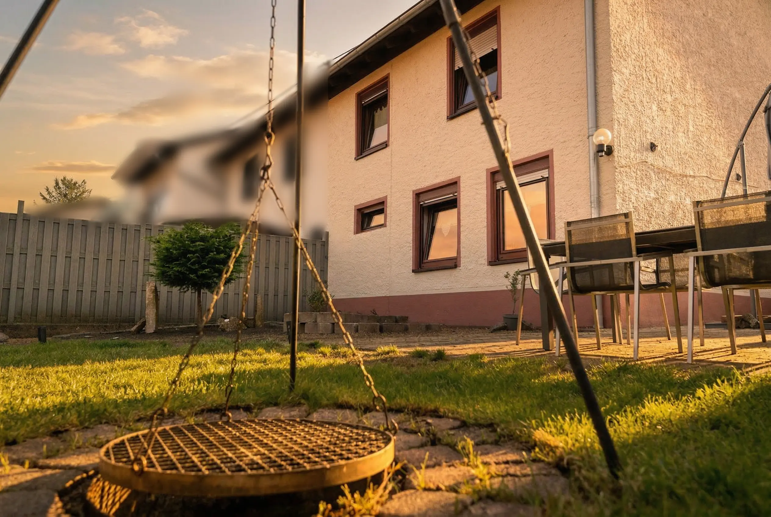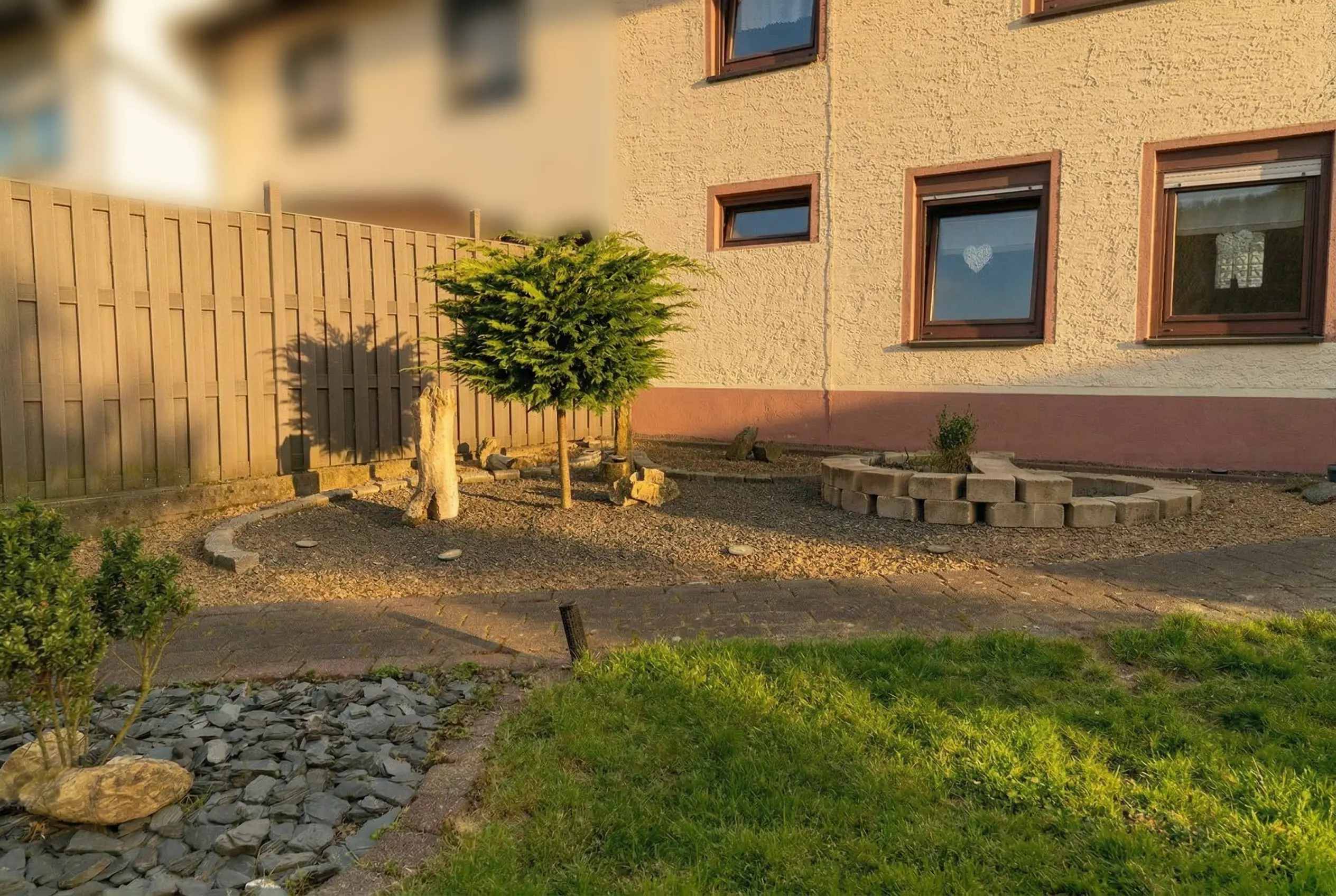 Der Außenbereich ist gepflegt, übersichtlich und gleichzeitig ansprechend gestaltet. Die Kombination aus Grünfläche, gepflasterten Wegen und dekorativen Elementen sorgt für eine angenehme Struktur.