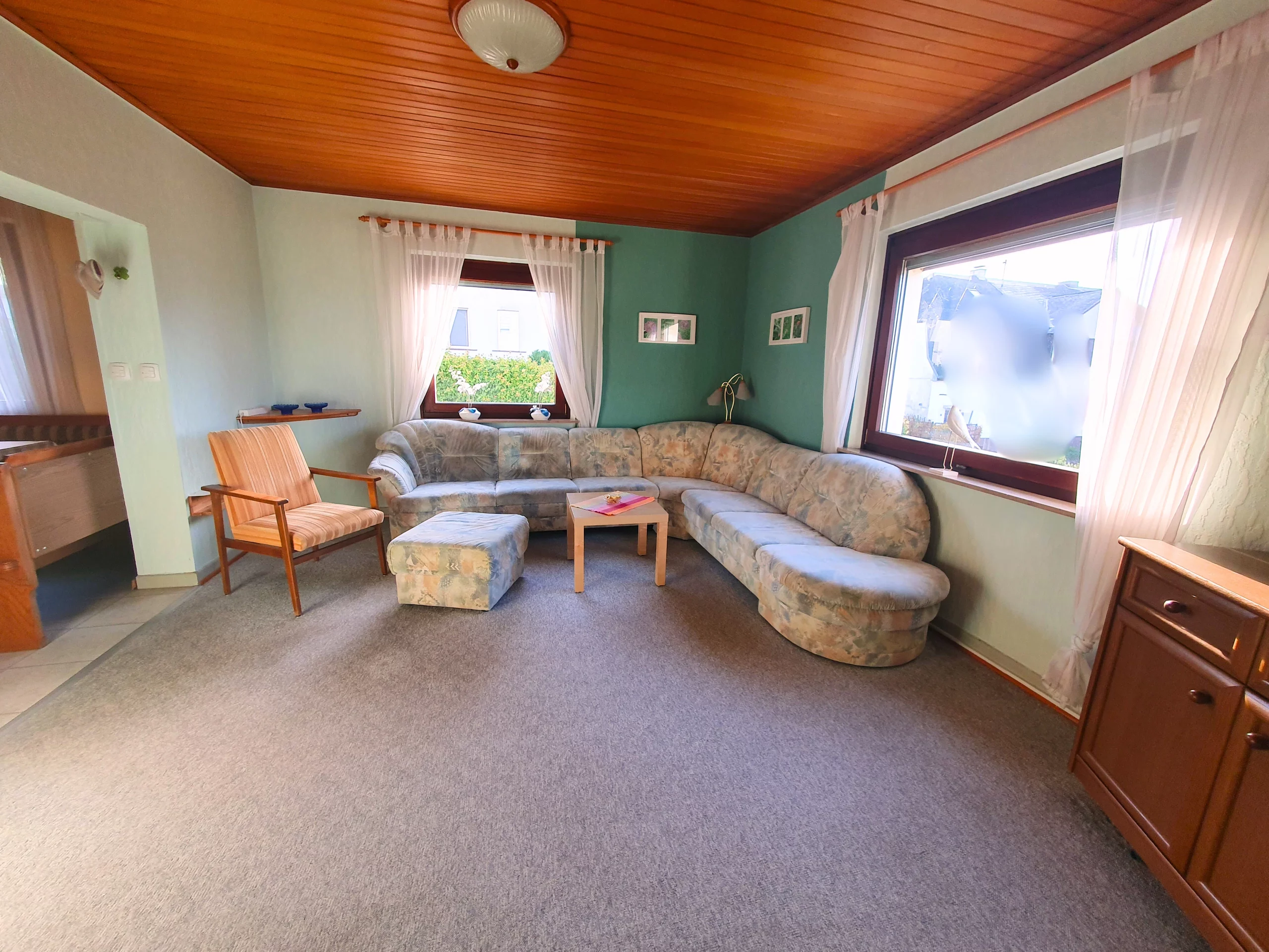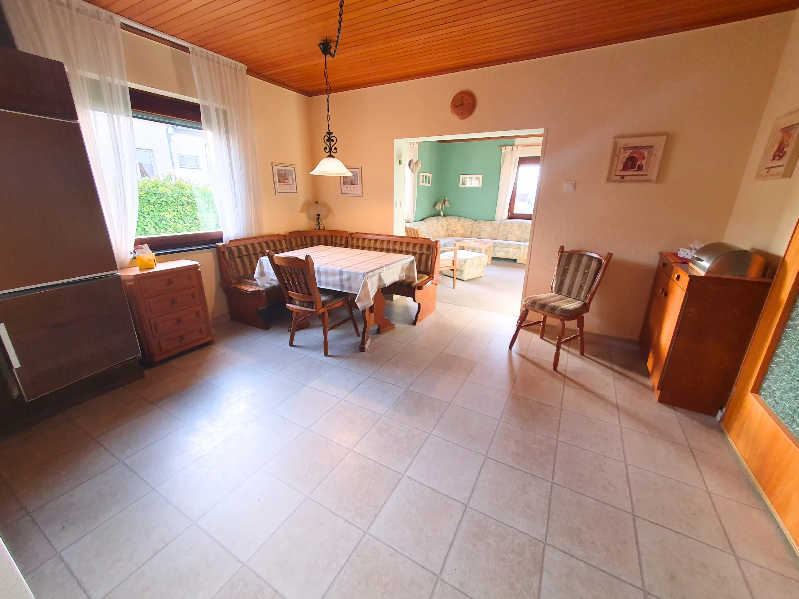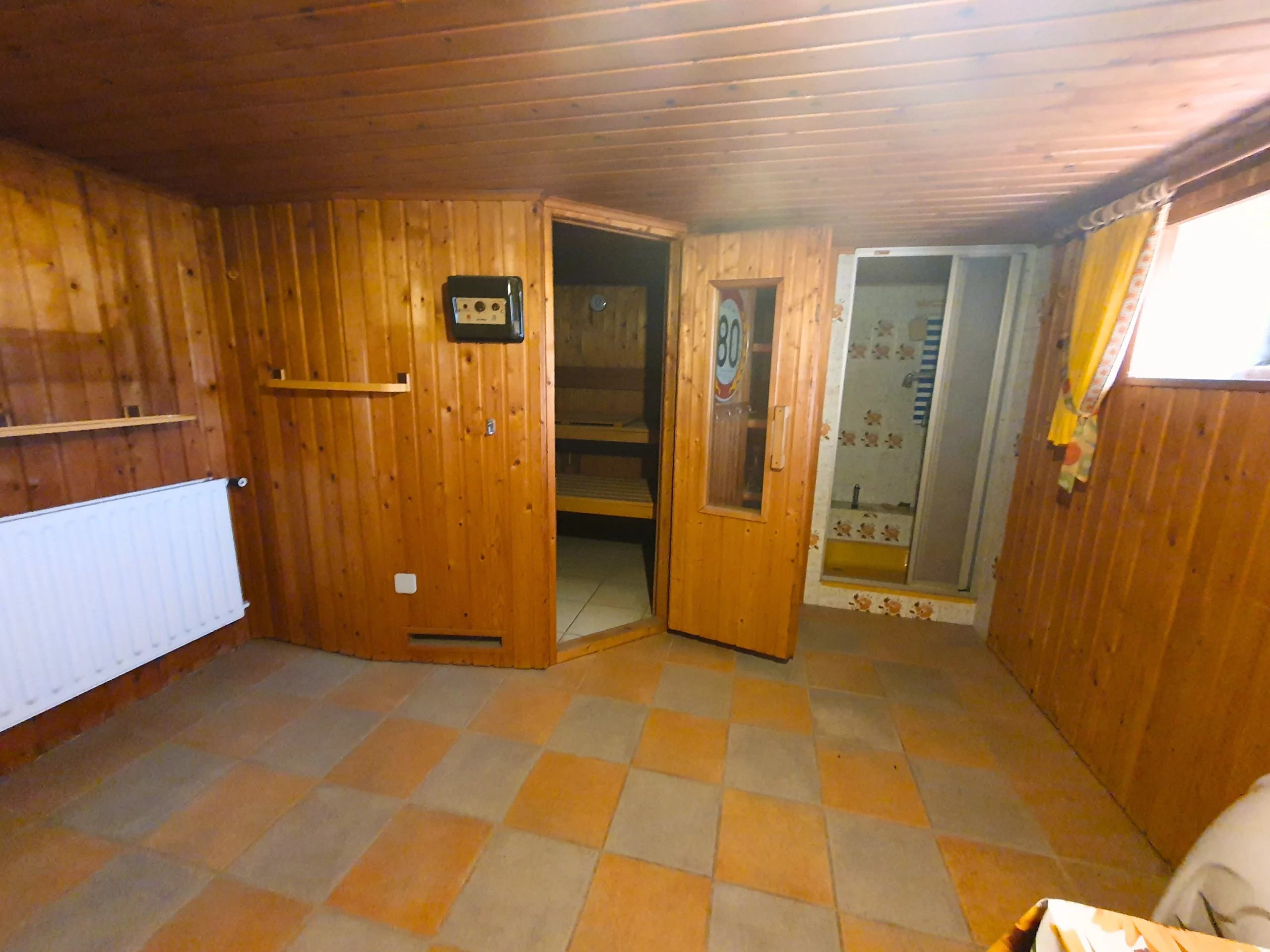 Das Haus ist unterkellert und wurde fortlaufend instandgehalten. Im Erdgeschoss befindet sich ein offener Wohn- und Essbereich mit direktem Zugang zur Küche. Großzügige Fensterflächen sorgen für viel Tageslicht. Zudem gibt es auf dieser Etage ein Schlafzimmer, ein Duschbad, ein separates Gäste-WC und einen Vorratsraum. Im Dachgeschoss stehen vier weitere Zimmer, eine kleine Küchenzeile sowie ein Duschbad zur Verfügung. Ideal für Kinder oder als separate Einheit. Im Kellergeschoss befindet sich neben den üblichen Kellerräumen ein gemütlicher Saunaraum mit Dusche – ein besonderes Extra für entspannte Stunden im eigenen Zuhause.